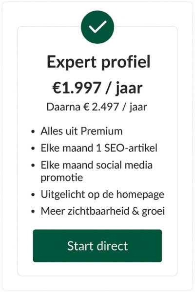 Je profiteert van alle voordelen uit het Premium Profiel, uitgebreid met maandelijkse content, structurele zichtbaarheid en autoriteit binnen het platform.